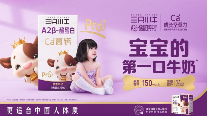同时,三只小牛还精准锚定转奶期喂养场景,将目光投向全中国84.2%的肠道敏感宝宝,并通过A2β-酪蛋白纯牛奶重新定义“宝宝的第一口牛奶”,125ml的小量包装,从原奶品质到容量的全程创新,为家庭喂养场景树立新标杆。