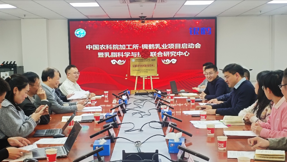 2026年1月12日下午,中国农业科学院农产品加工研究所(以下简称“加工所”)与齐齐哈尔银鹤乳业有限公司(以下简称“银鹤乳业”)隆重举行乳脂深加工技术研究及新产品开发项目启动会,同期举办“乳脂科学与技术联合研究中心”揭牌仪式。加工所王海峰副所长,银鹤乳业董事长兼总经理骆志刚、副总经理何卫加参加了项目启动会,乳品加工团队首席逄晓阳研究员主持会议。